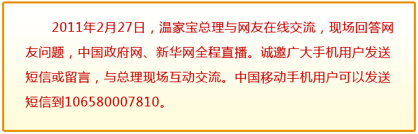 [中國移動用戶手機(jī)尾號7776]:總理,您好。很多百姓都好奇,作為總理,生活跟普通百姓有什么不同?您會像普通父母那樣經(jīng)常跟子女聊聊工作、生活嗎?您會走走親戚、與朋友、同學(xué)聚聚會嗎? |