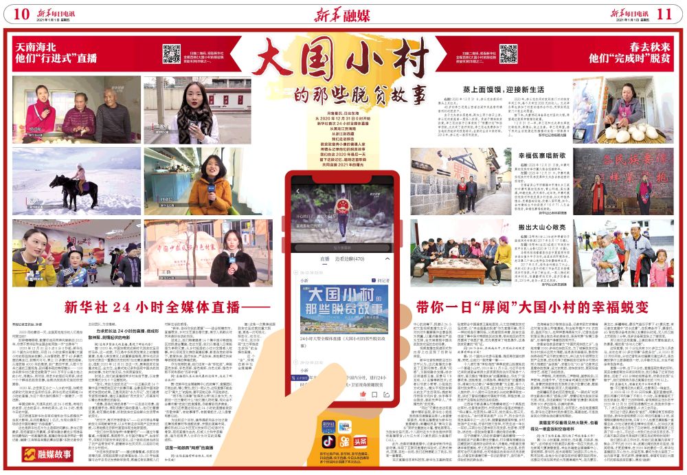 2020年12月31日0點0分0秒起,新華社26個國內分社聯動,開啟24小時全媒體直播《大國小村的那些脫貧故事》。從白雪皚皚、零下40多攝氏度的黑龍江,到椰風習習、零上10多攝氏度的海南,從海拔超4000米的高原,到廣袤的平原,從數十萬米之遙的衛星視角,到纖毫畢現的特寫鏡頭……100余名新華社記者走進散落于960萬平方公里土地上的小村,用鏡頭、用對話、用老鄉的皺紋與笑容,講述一個個鮮活的脫貧故事,繪就決戰脫貧攻堅的恢宏畫卷。