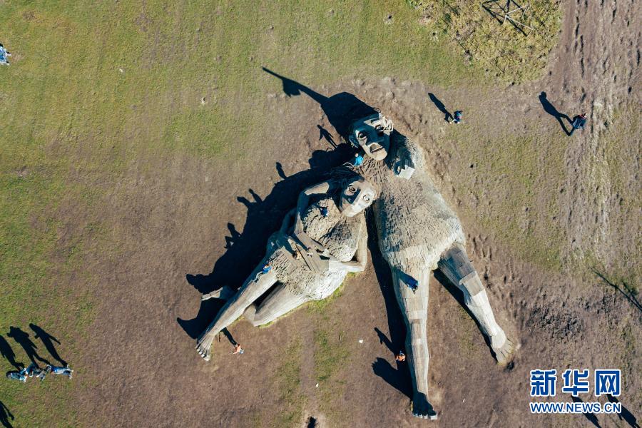 這是3月20日在比利時(shí)博姆市的德舒爾森林公園拍攝的“巨人”雕塑(無(wú)人機(jī)照片)。新華社記者 張鋮 攝