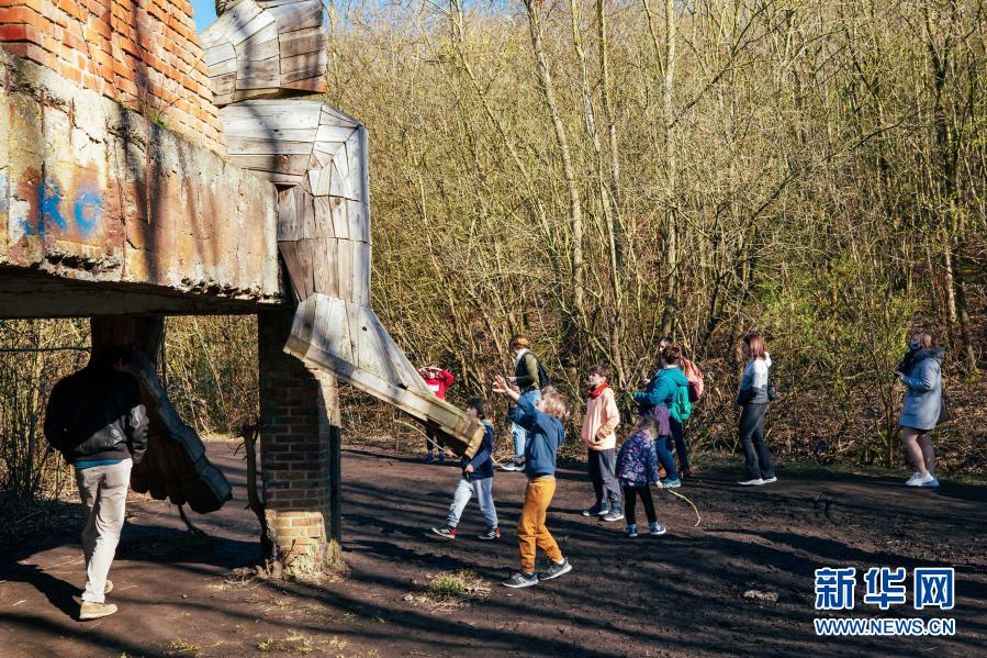 3月20日,人們?cè)诒壤麜r(shí)博姆市的德舒爾森林公園和一座“巨人”雕塑“玩耍”。新華社記者 張鋮 攝