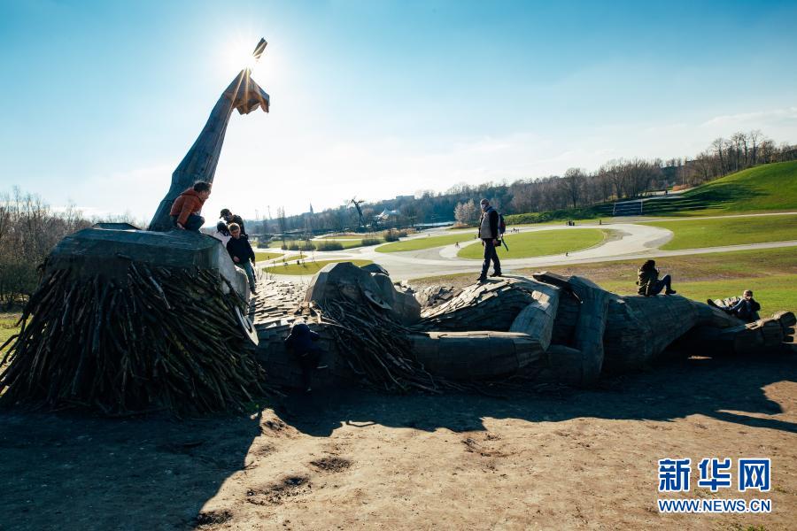 這是3月20日在比利時(shí)博姆市的德舒爾森林公園拍攝的“巨人”雕塑。新華社記者 張鋮 攝