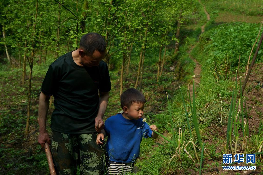 5月4日,林興聰帶著孫兒林關邱栩去地里勞作。 新華社記者 江宏景 攝