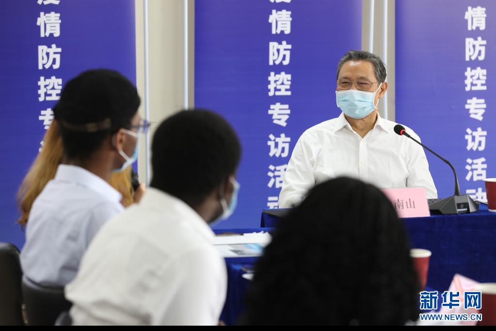 2020年4月15日,廣州市人民政府新聞辦公室在廣州醫(yī)科大學(xué)舉辦廣州市第78場疫情防控新聞采訪活動,鐘南山與在穗工作學(xué)習(xí)的外籍人士代表進行座談交流。新華社記者 李嘉樂 攝