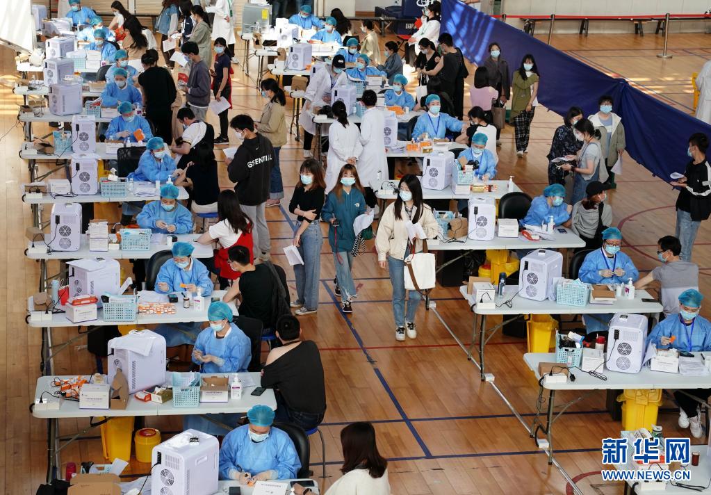 2021年3月28日,在華東師范大學(xué)閔行校區(qū)體育館內(nèi),師生們在接種新冠疫苗。新華社記者 劉穎 攝