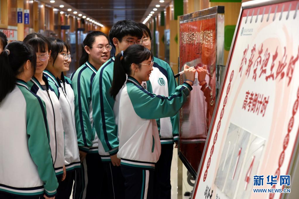 5月23日,青島通濟實驗學校高三學生在簽名板上留言相互鼓勵。