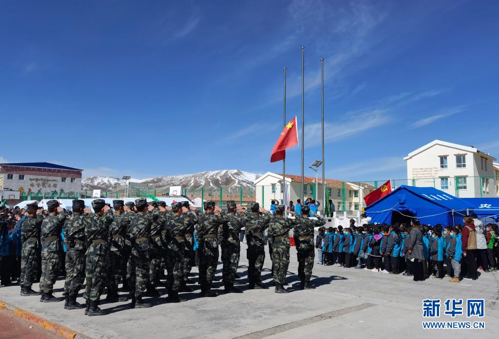 5月24日,武警青海總隊果洛支隊機動大隊官兵與花石峽鎮藏文中心寄宿制小學的師生一同參加升國旗儀式。新華社發(宦爵才郎 攝)