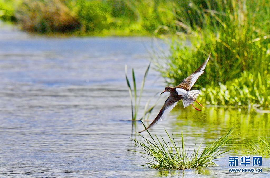 初夏,紅腳鷸在位于西藏拉薩的拉魯濕地國家級自然保護區內起舞覓食。