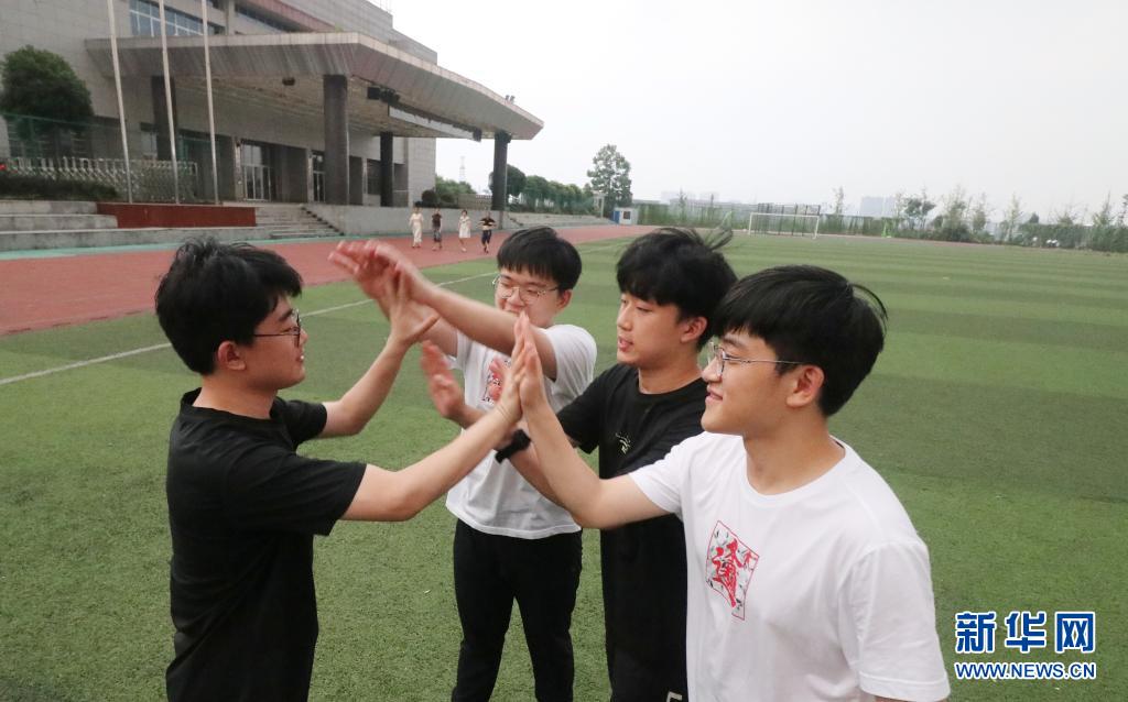 6月9日,在湖南省婁底市第四中學,四胞胎兄弟在高考后擊掌,慶祝順利完成考試。