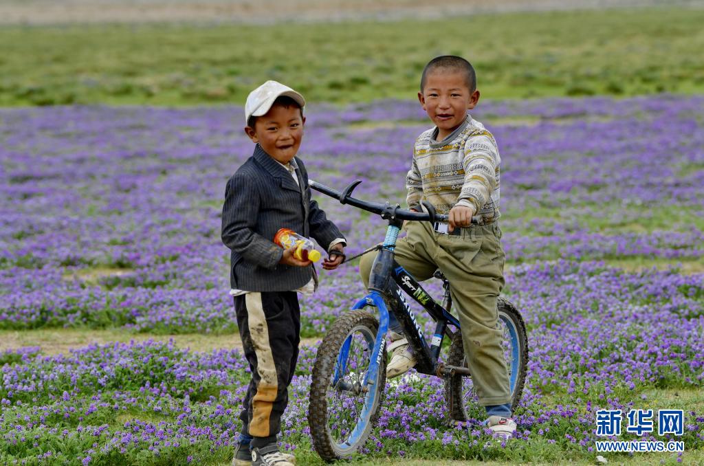 西藏當雄縣格達鄉格達村的兒童在草場玩耍(6月19日攝)。
