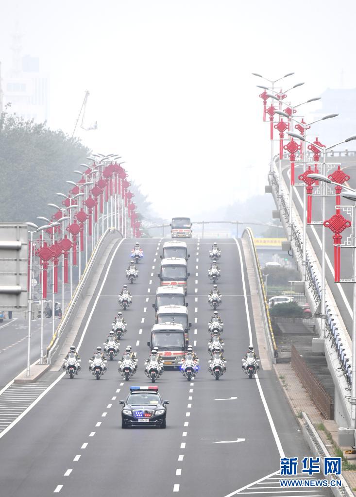 這是“七一勛章”獲得者集體乘坐禮賓車從住地出發,由國賓護衛隊護衛前往人民大會堂。