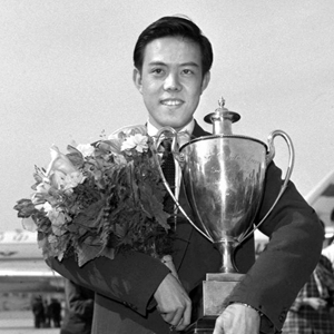 1959年4月5日,容國團在德國多特蒙德舉行的第25屆世界乒乓球錦標賽男子單打決賽中戰勝匈牙利選手西多,獲男子單打比賽冠軍。圖為1959年4月22日,容國團載譽歸來。新華社記者 張赫嵩 攝