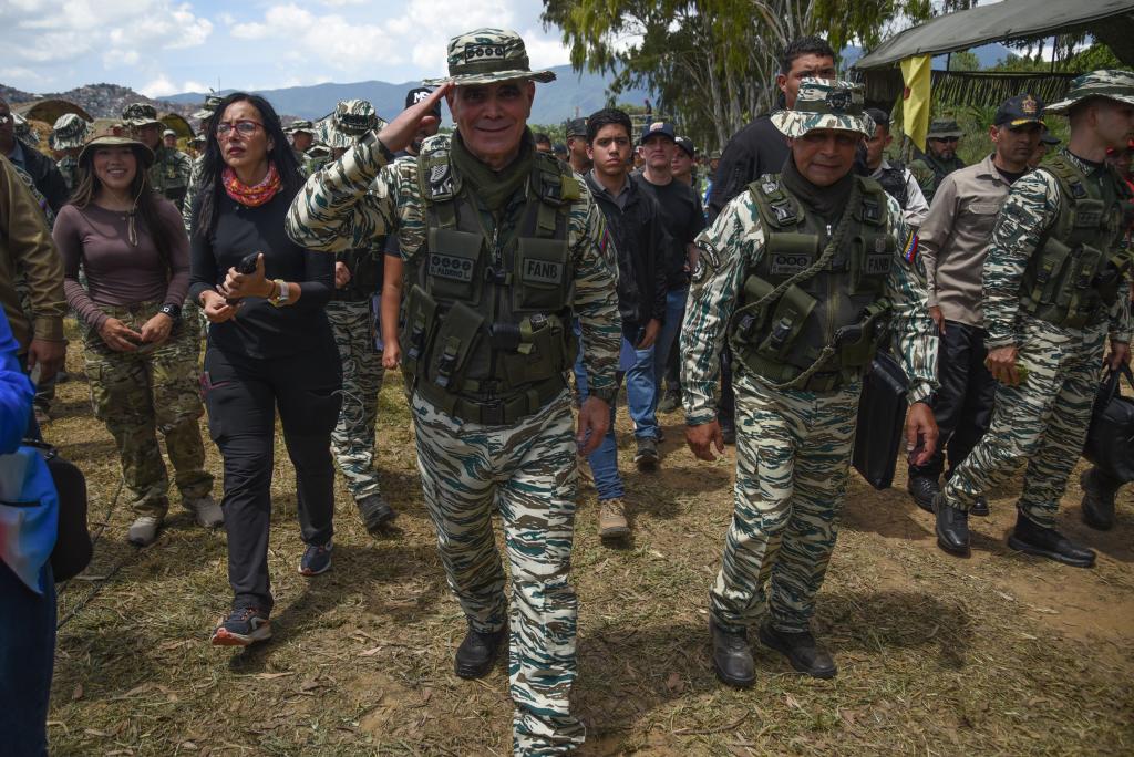 9月13日,委内瑞拉国防部长帕德里诺·洛佩斯(中)在位于首都加拉加斯的蒂乌纳堡陆军基地视察民兵训练。新华社发(萨尔戈多摄)