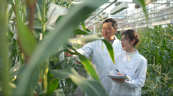 中国农业大学师生在作物功能基因组与分子育种研究中心查看玉米表型。(中国农大供图)
