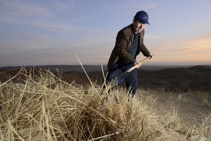 2013年11月19日,王有德在毛乌素沙漠边缘扎草方格。(新华社记者 王鹏 摄)