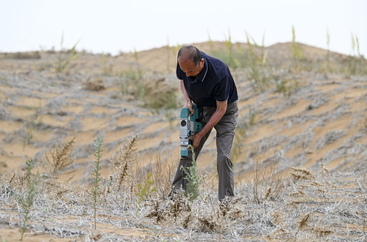 “有一天,我干活累得走不动了,就顺手找了根木棍拄着,这一拄,拄出了一个好主意。棍子在沙漠里扎出的一个个洞,启发我设计出‘干’字形铁制植苗工具。”唐希明说。