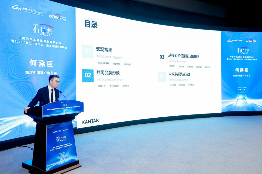 研讨会上,凯度中国客户群总监何燕臣分享了《中国汽车出海品牌研究报告(CAAB)》阶段性研究成果。经过半年多的重点企业访谈、数据实证、定性定量分析、案例研究等工作,报告用量化指标和实例分析了“中国汽车”大品牌的现状、目标和实现路径,为企业高质量出海及中国汽车整体形象提升提供了理论支持。报告揭示了出海过程中五个核心的价值锚点,并结合海外市场调研数据凝练出相应的差异化发展关键词,进而搭建能够实现品牌形象跃迁的战略框架。报告还通过品牌力、溢价力和长驱力三个关键指标和相应实现路径,建立起了属于中国汽车的品牌价值体系,旨在能够帮助企业清晰梳理自身品牌后续发展规划,促进企业合力构建有感知、可信任的“中国汽车”大品牌形象。