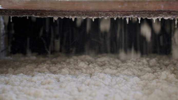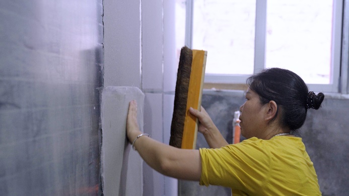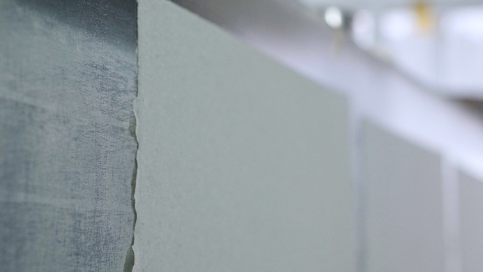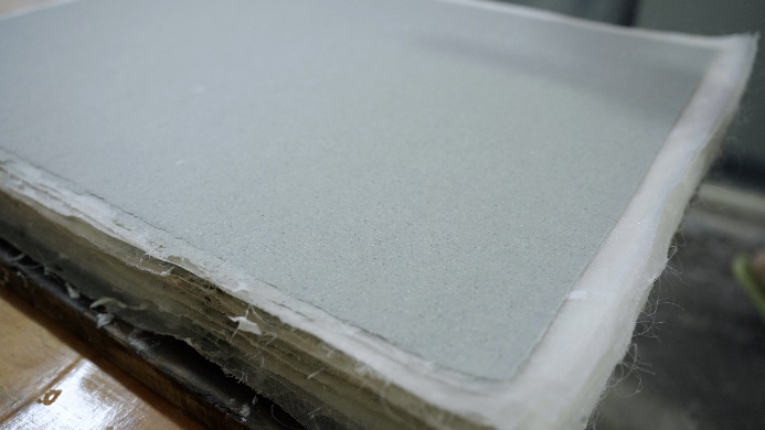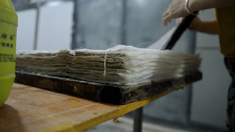 一层浅灰色的纸浆,一层黄白色的纱网,层层叠叠相互交错,摞成整齐的“豆腐块”。压出多余水分后,这些“豆腐块”被送往烘干车间,由工人师傅用刷把湿纸贴到焙墙上,并刷平、刷匀。