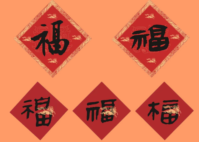 大小五个福字取自马王堆帛书与沈尹默字体。大福字周身环绕的飞马纹样,源自《中国纹样全集》所载的宋代石刻纹,纹样古朴灵动,充满宋代典雅风韵。小福字则是将飞马纹样放置于福字上,意为“骐骥载福”。