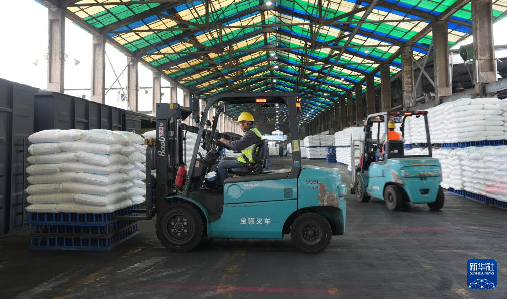 2月24日,在云南水富云天化有限公司火车发货站台,工人在用叉车转运化肥。