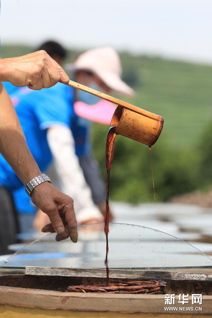7月10日,工人在畢節市金沙縣禹謨鎮泡木灣醬醋基地查看醬醋發酵情況。貴州省畢節市金沙縣禹謨鎮是傳統醬醋生產大鎮,年產陳醋2萬余噸。在長期的釀造實踐中,禹謨鎮利用當地獨特的環境資源,用100多味中草藥與麥麩制曲,以當地優質大米、玉米為原料,經過70多道工序,經一年以上露天發酵成獨特的“醬香醋”。該釀醋技藝2019年被列入貴州省級非物質文化遺產名錄。今年以來,禹謨鎮將醬醋產業與旅游業結合起來一體化推進,把泡木灣醬醋基地打造成國家3A級景區,有效拓寬當地群眾增收致富途徑,走出了一條工旅融合的鄉村振興新路。新華社發(韓賢普攝)