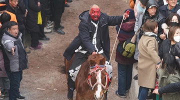 2月9日,在孔子博物馆举行的山东文物精品展上拍摄的山东省文物考古研究院收藏的大汶口文化花瓣纹彩陶壶。