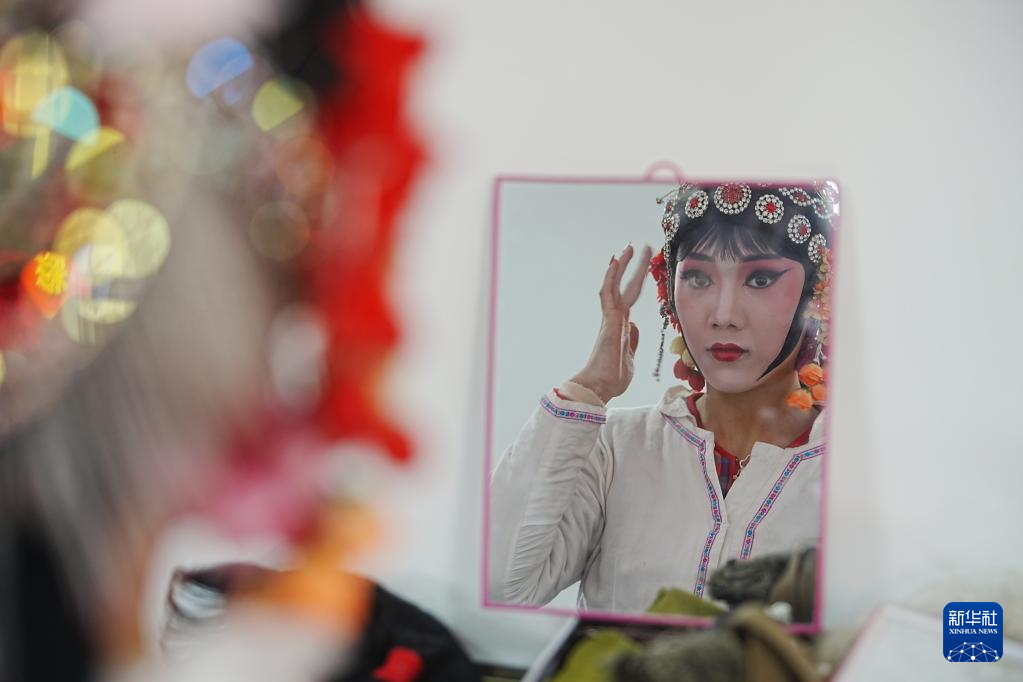 2月15日,演员在石家庄市鹿泉区南甘子村文化广场演出后台整理戏服和头饰。