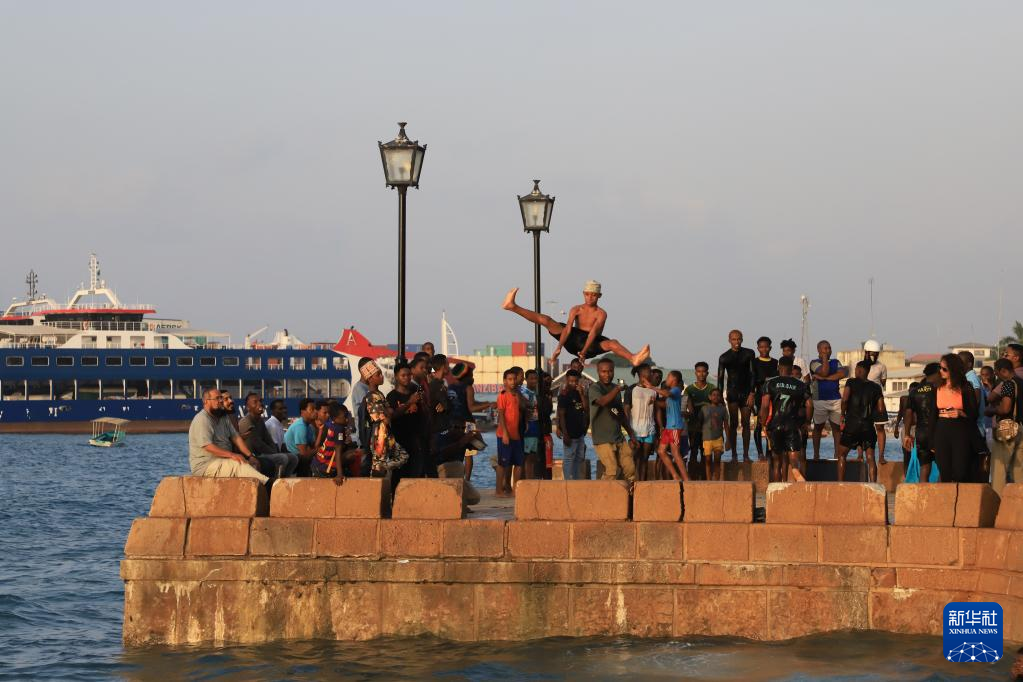 2月21日,人们在桑给巴尔石头城海边休闲。