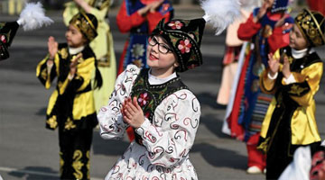 3月21日,人们在吉尔吉斯斯坦首都比什凯克阿拉套广场参加纳乌鲁斯节庆典表演。