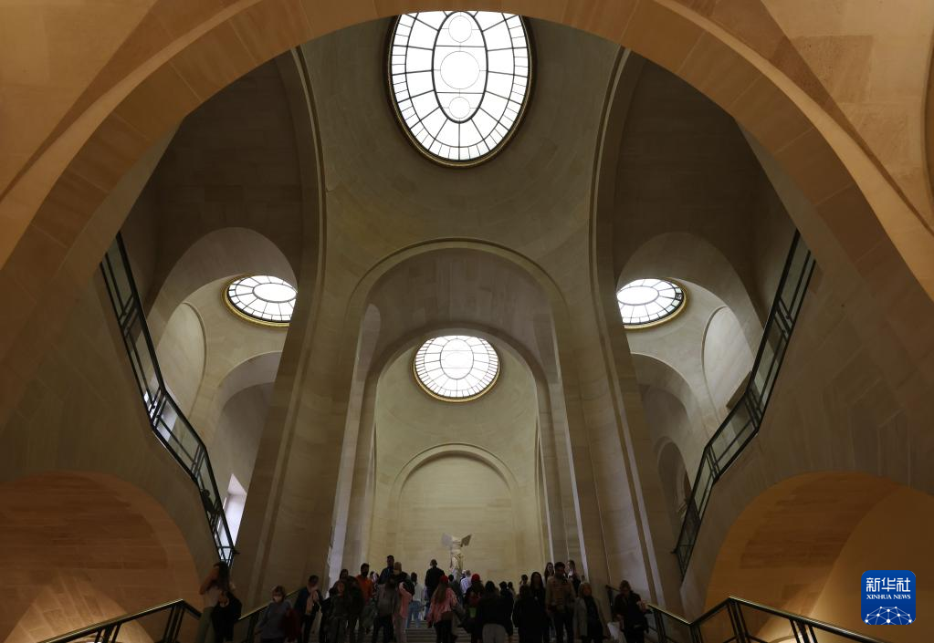 3月22日,在法国巴黎卢浮宫,人们穿过钟阁走进古埃及文物展厅。