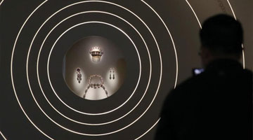 4月12日,游客在禹州市神垕古镇观赏展出的钧瓷作品。
