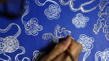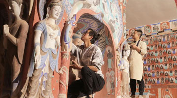 5月11日,在位于敦煌市的莫高里工匠村,学员为莫高窟复制窟进行彩绘。
