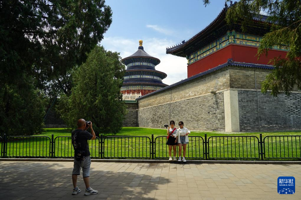 游客在天坛祈年殿外打卡拍照(7月10日摄)。天坛始建于明永乐十八年(1420年),是世界上现存规模最大、保存最完整的古代祭天建筑群,1998年被列入世界文化遗产名录。