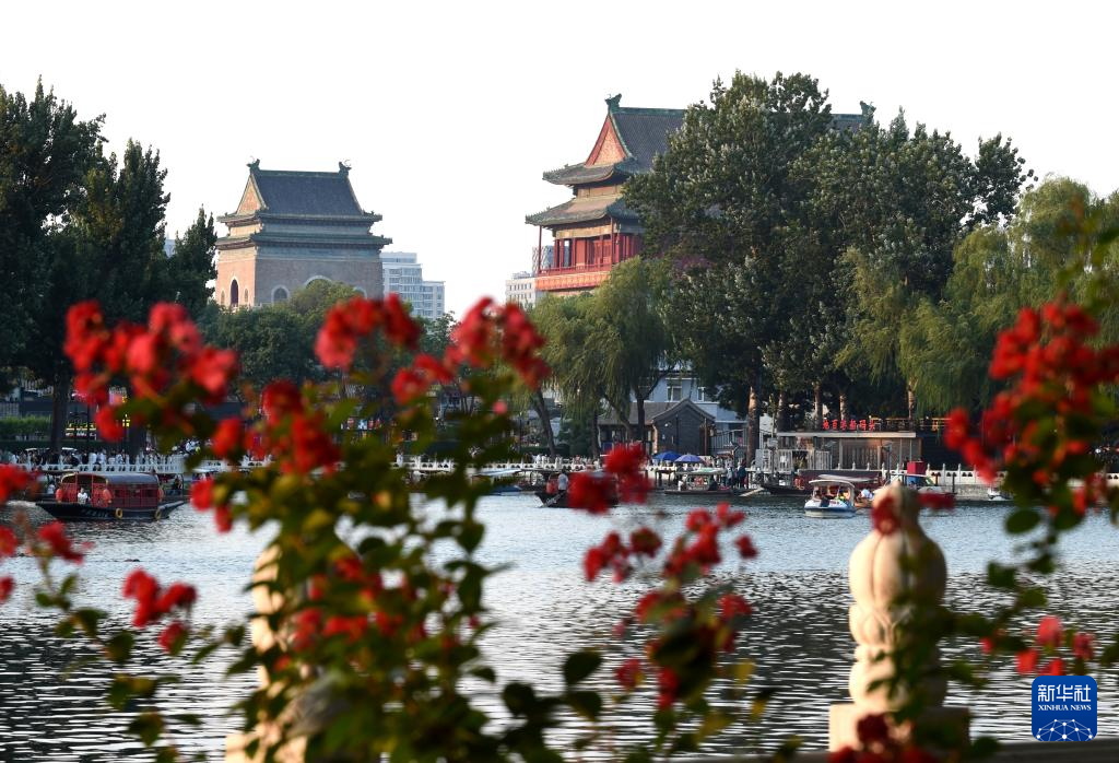 从什刹海东岸远眺北京钟鼓楼(7月17日摄)。钟鼓楼位于北京中轴线的最北端,两楼前后纵置,气势雄伟。作为元、明、清三代都城的报时中心,至今已有700多年的历史。
