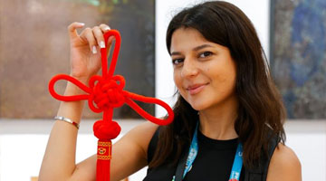 8月3日,河南省禹州市神垕镇一家钧瓷企业的工作人员在展厅里向来访者介绍钧瓷作品。
