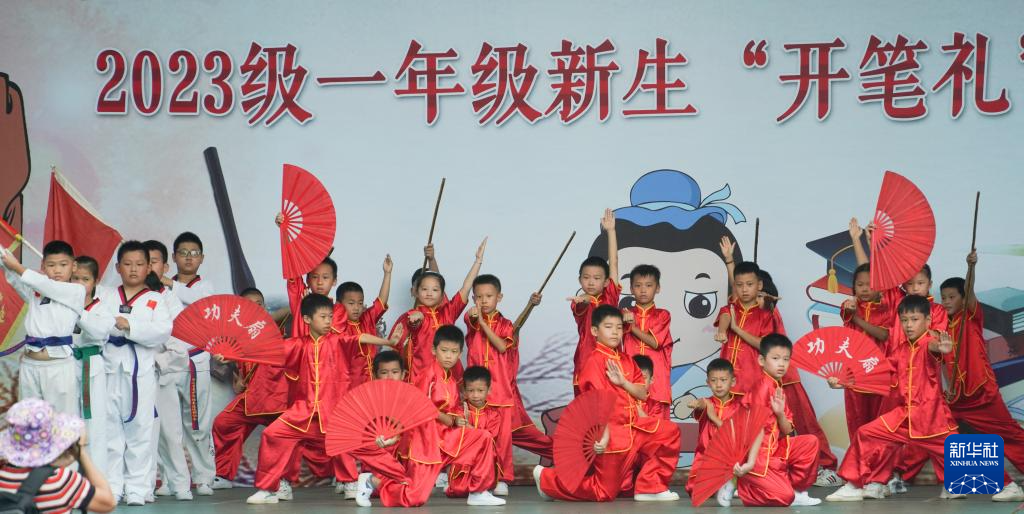 8月30日,海口市玉沙实验学校的武术队在“开笔礼”仪式活动现场表演。