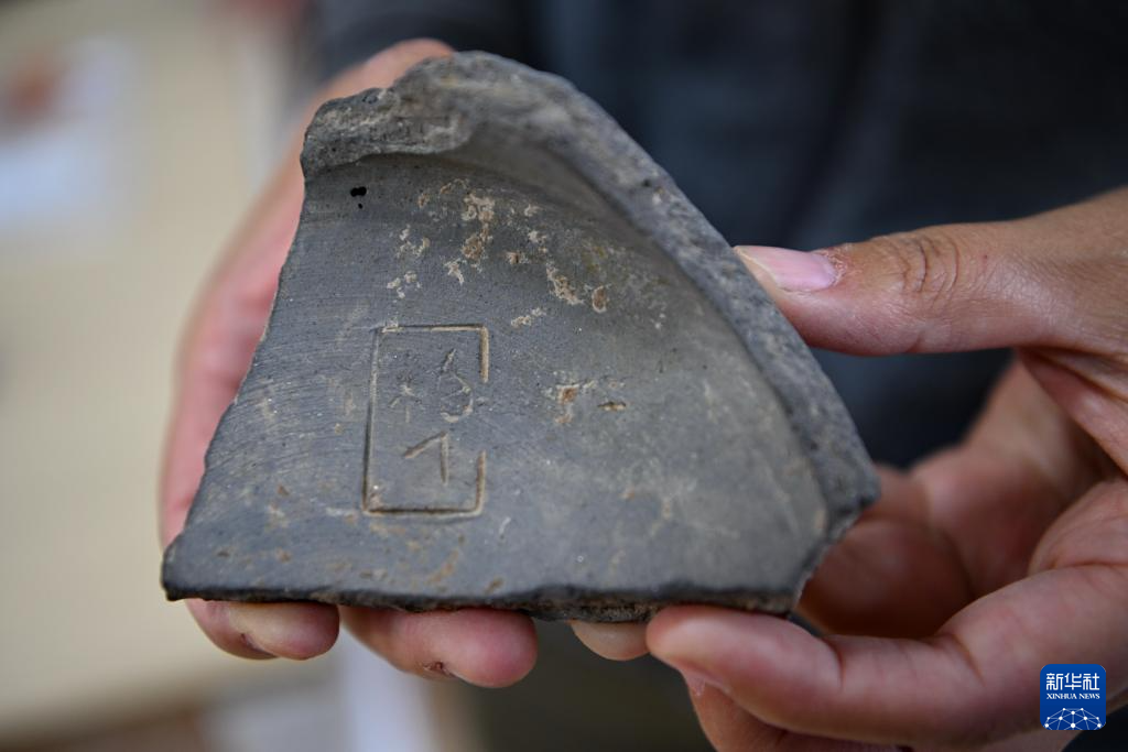 10月8日,考古队员展示柏人城遗址出土的带有文字的陶片。