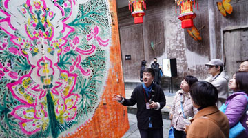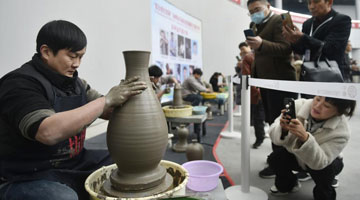 11月16日,在安徽展区,人们在师傅(左)的指导下现场体验宣纸制作。