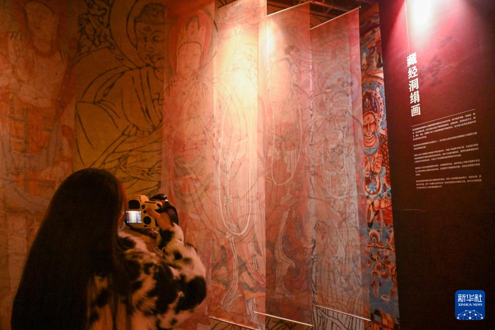 11月28日,在天津数字艺术博物馆,观众参观展出的藏经洞绢画。