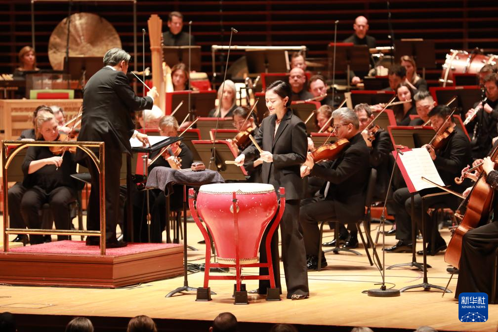 1月12日,在美国费城,上海交响乐团打击乐演奏家付艺霏(中)在2024年费城交响乐团新春音乐会上演出。