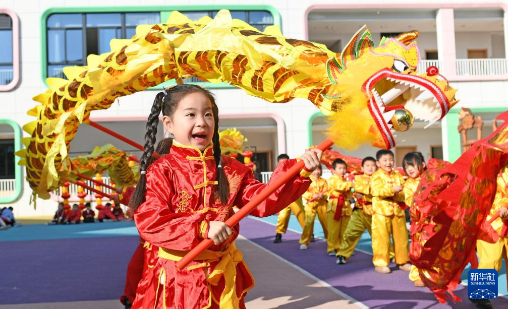1月18日,浙江省台州市仙居县迎晖幼儿园的小朋友在舞龙表演,喜迎龙年新春。