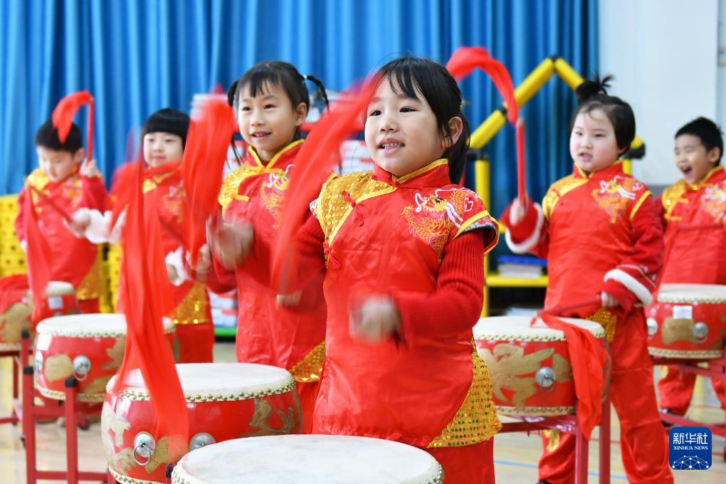 1月19日,山东省烟台市福山区实验幼儿园的小朋友在敲鼓。