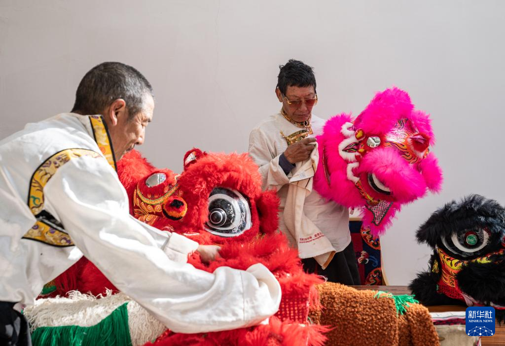过去受条件所限,邓巴阿尼没有闲钱购买舞狮的道具,他就自己动手,用布料和胶水做出狮头,再给毯子缝上草绳编的毛发做成狮皮。“后来生活条件慢慢变好,政府也给了很多支持,我们不仅有钱购买舞狮道具,还有机会去各地表演。”邓巴阿尼说。2022年,由狮子舞改编的节目《吉韵硕督》登上了西藏电视台的藏历新年联欢晚会。2023年,邓巴阿尼和村民们又将狮子舞搬上了中国西藏旅游文化国际博览会昌都馆的舞台。