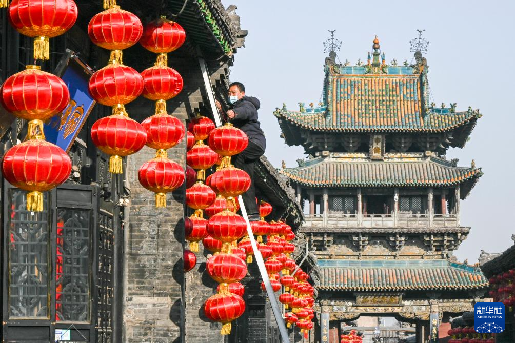 1月29日,工人在山西省晋中市平遥古城悬挂大红灯笼。