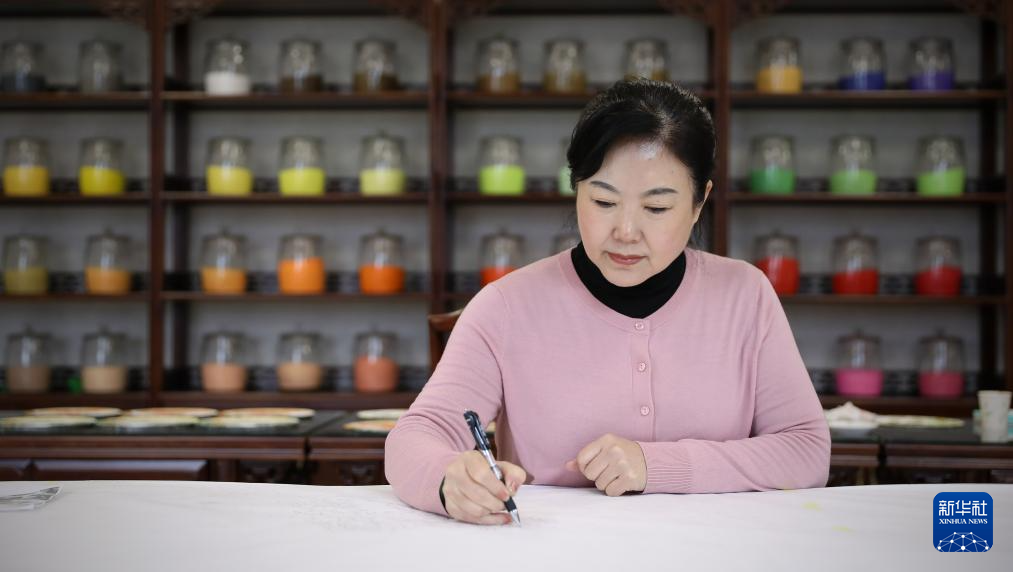2月22日,刘晶涛在凤城市内的工作室挑选制作景泰蓝珀晶画需用的釉料。