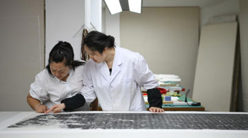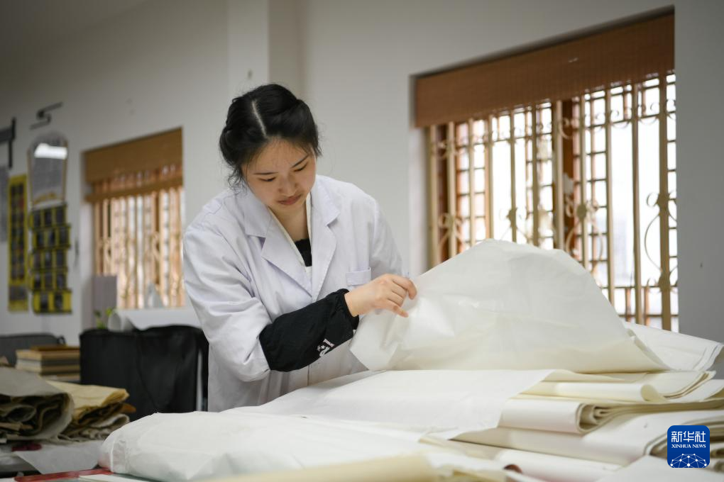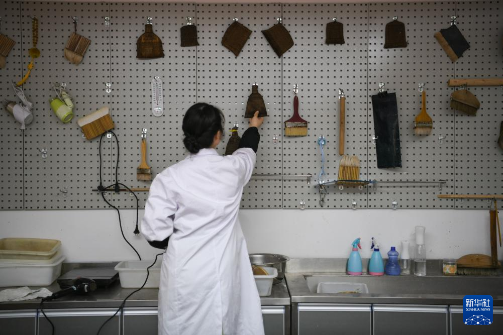在四川西部文献修复中心,唐陈韵将修复用的托纸上墙晾干(4月19日摄)。