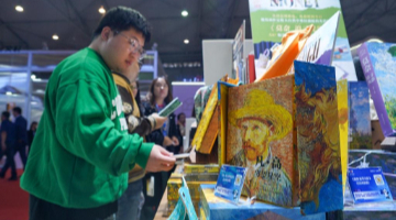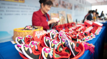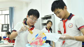 一名老师带着几名孩子在广西来宾市象州罗秀镇纳禄村学习扇面制作(10月10日摄)。