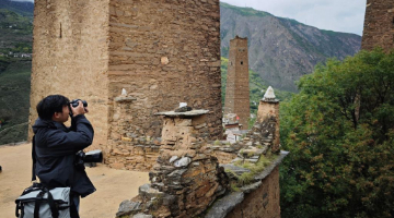 两名游客在广西来宾市象州县罗秀镇纳禄村的古宅里翩翩起舞(10月10日摄)。