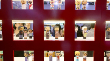 10月21日,一名表演者在开幕式会场外与观众互动。