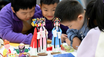 12月9日,爸爸在家里指导庄恩琪(中)练习英歌。