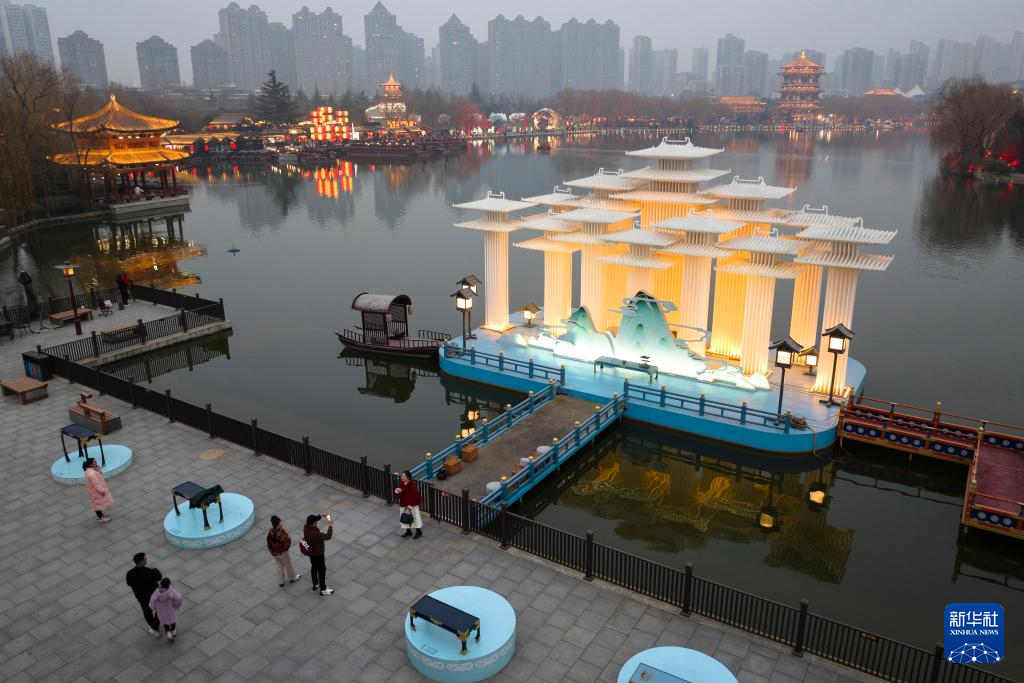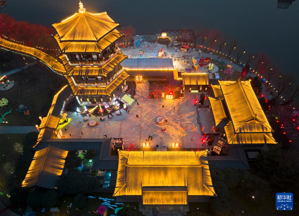 1月22日晚拍摄的西安大唐芙蓉园内的巨型彩灯(无人机照片)。